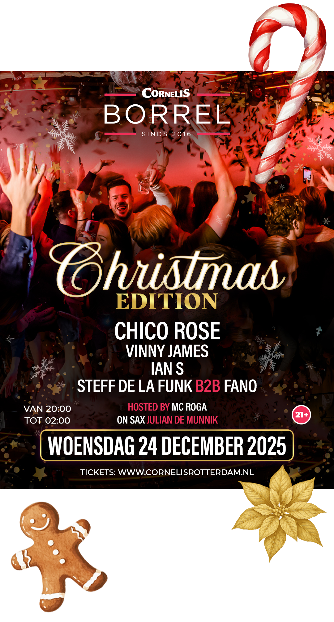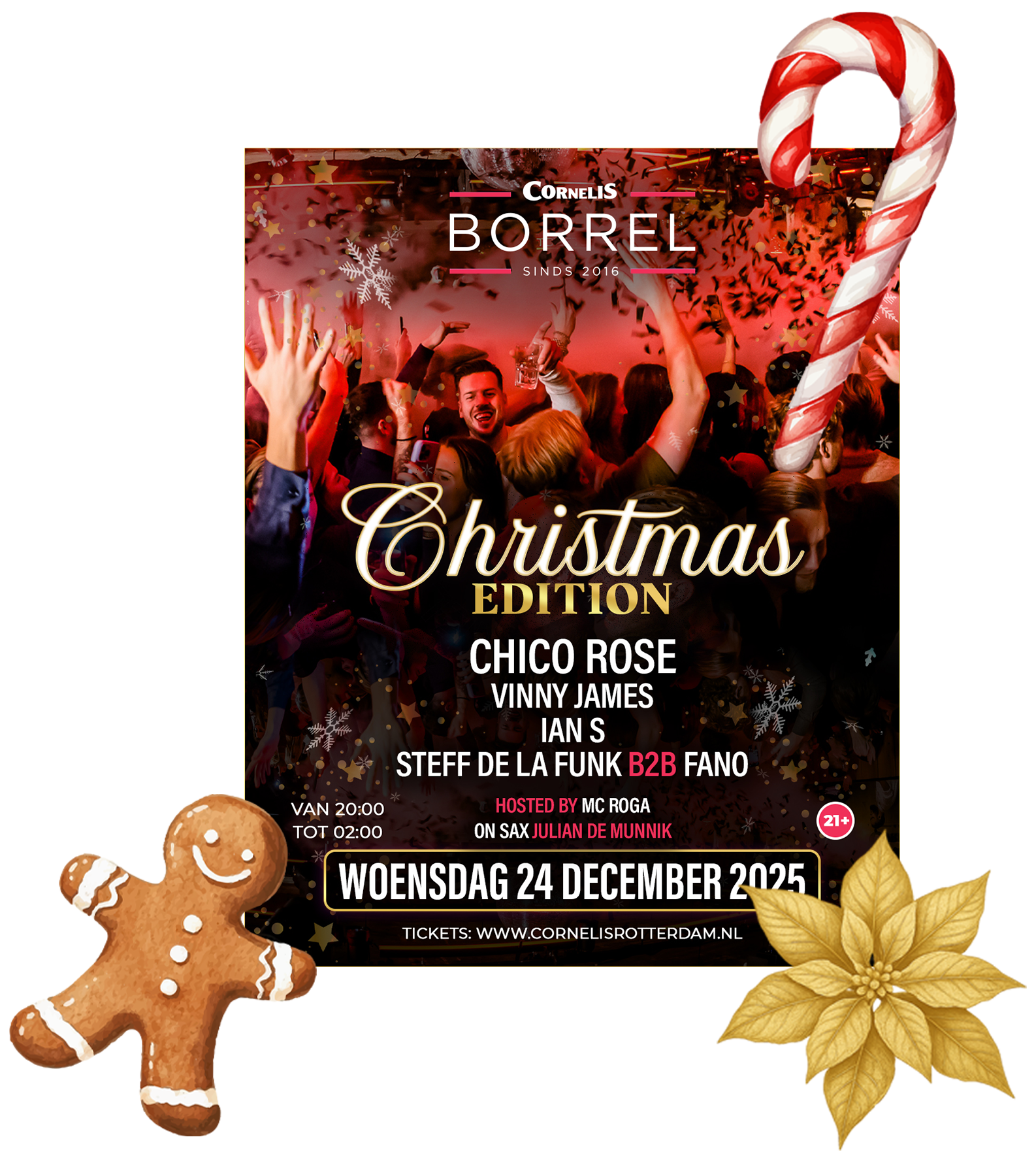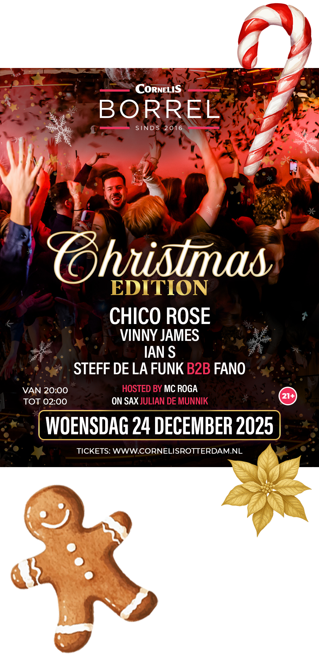 Op kerstavond nodigen we je uit voor het gezelligste feest van het seizoen. Cornelis heeft de stijlvolste kerstsetting van Rotterdam vol fonkelende lichten, glitters, en een line-up die zorgt voor een avond om nooit te vergeten.